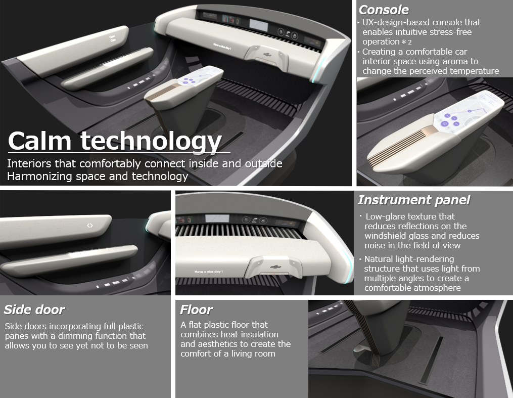 Based on the unique Japanese sensibility of finding beauty in everyday life and being considerate, the interior concept facilitates design that avoids being more intrusive than necessary, while communicating appropriately with the user in a natural way. This has been embodied through the plastic material technology, manufacturing methods, and structures that we have developed, and is expressed as calm technology.