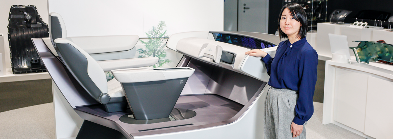 「C2035」では、ステアリングのグリップに、私が研究する心地良い触感の数値を反映させた開発品を採り入れています。ステアリングは滑りにくさという機能性と心地良さの両方が求められるため、それらを両立できる素材を選び、シボ加工を施しました。トリム部分には「Circular economy」実現に向けて開発を進めている、地元広島の名産である牡蠣の殻を活用したアップサイクル表皮を使用しています。またパネルの部分はやわらかな質感の光透過スエード調表皮でリラックス感を表現したり、当社オリジナルのアロマを搭載したりすることで「Calm Technology」実現に向けた提案を織りこみ、グループ全員の力で将来の製品開発の目標となる車室空間を形にしました。