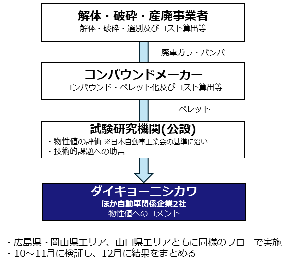 ダイキョーニシカワ株式会社(以下、当社)は、経済産業省による「令和7年度経済産業政策関係調査事業(自動車分野における再生プラスチック材の供給促進に向けた地域間連携・調査事業)」の一環として、中国経済産業局が主導する「再生材回収・供給強化に向けた地域別WG(ワーキンググループ)」の中国地域WGに参画します。 本事業は、政府策定の「プラスチック資源循環戦略」において、2030年までにプラスチックの再生利用を倍増させる目標が掲げられていることや、欧州連合(EU)でも、自動車設計・廃車管理における指令「ELV(End-of-Life Vehicles)規則案」で、新車製造時の再生プラスチック(以下、再プラ)の利用義務化が提案されていることを受けて実施されるものです。事業を通じて、地域内の再プラの供給ネットワークや全国規模での再プラ流通市場の構築に向けた、製品をつくる側(動脈産業)と、不要になった製品を再利用する側(静脈産業)の連携を後押しすることを目指しています。 WGには当社のほかに解体・破砕・産廃事業者、コンパウンドメーカー、試験研究機関(公設)が参画しています。広島県・岡山県エリアと山口県エリアをそれぞれ担当するチームに分かれて活動し、チームごとに再プラの回収・ペレット化およびその物性値評価を行います。当社は両方のチームに所属し、物性値評価に対して自動車部品の規格に達しているかどうか等について評価します。検証期間は2025年10月~11月で、結果に基づき、動・静脈産業連携に向けた課題や検討事項を整理します。