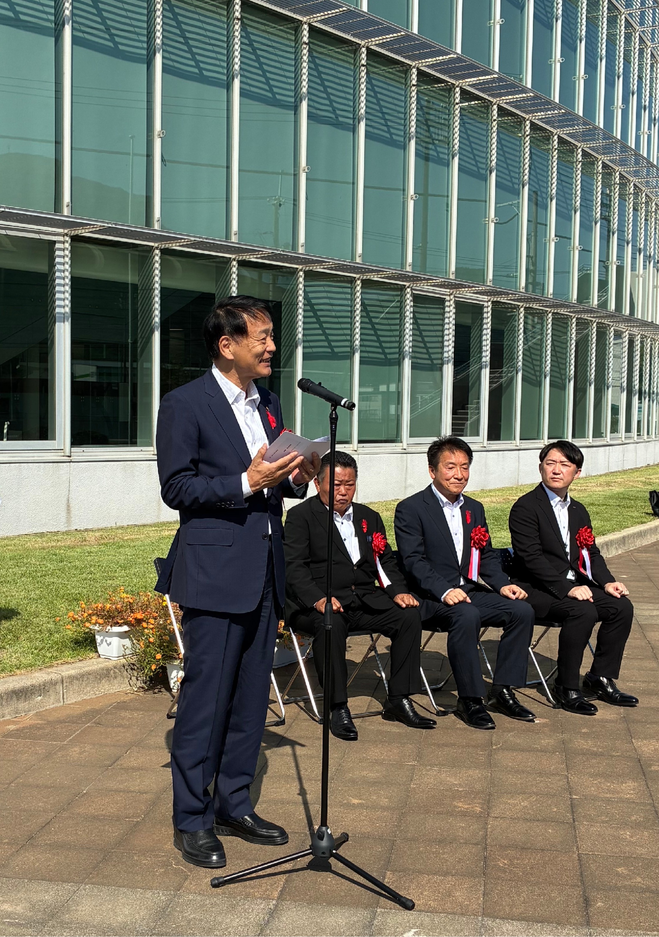 当社代表取締役社長 杉山 郁男 ご挨拶(要約) 防府市に四つの生産拠点がある当社は、多くの社員やその家族がこの町で学び、働き、暮らし、地域の一員として日々を過ごしています。本日は、鶴浜・中関・西浦の各拠点の代表者も出席しております。 私たちはものづくりに励むと同時に、地域とともに歩む企業でありたいと願っています。『スクエア』には“広場”“交差点”“中心”といった意味があり、人と人が出会い、交流し、笑顔が広がる場所となることを願って名付けました。 ネーミングライツによる支援が、施設のメンテナンスやスポーツ振興事業に活用され、地域の皆さまの健康づくりや、スポーツ・文化活動を通じた交流の場づくりに貢献できることは、私たちにとって大きな意義のある取り組みであり、企業理念に掲げる『人・社会・地球を大切にする』『地域から信頼される企業を築く』という想いを形にしたものです。 「ダイキョーニシカワ スクエア」が防府市にとって誇れる場所となることを願うとともに、私たちも地域の皆さまとともに歩み続けてまいります。