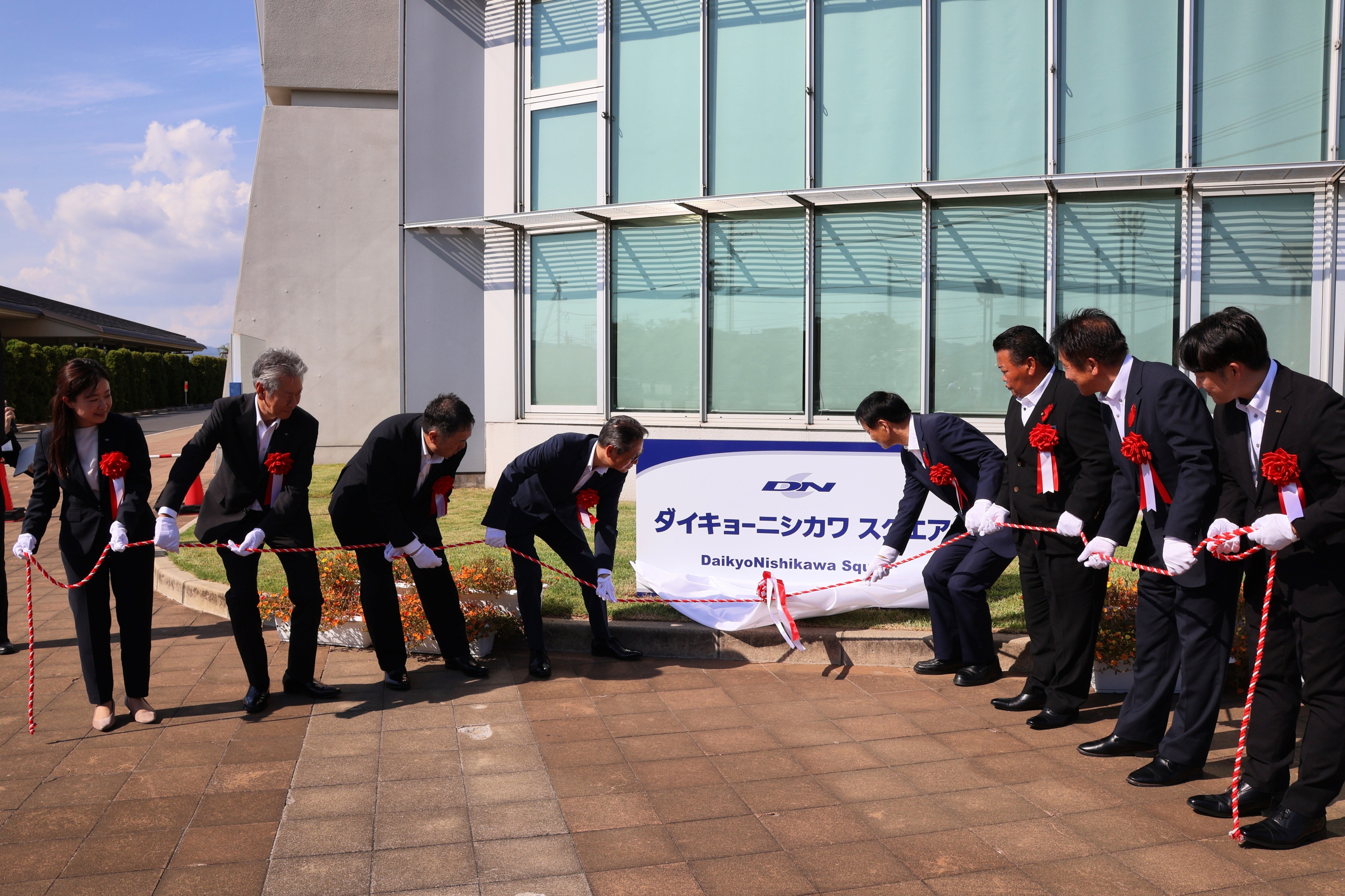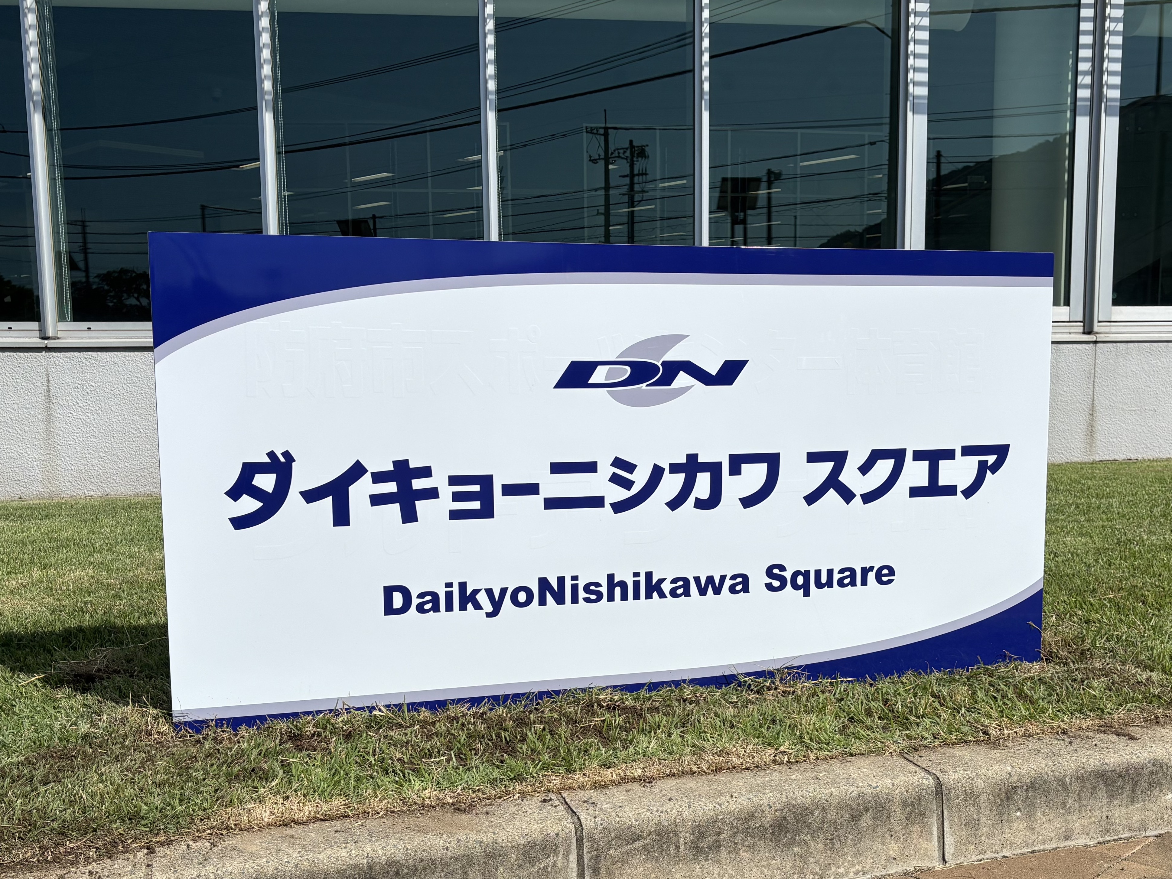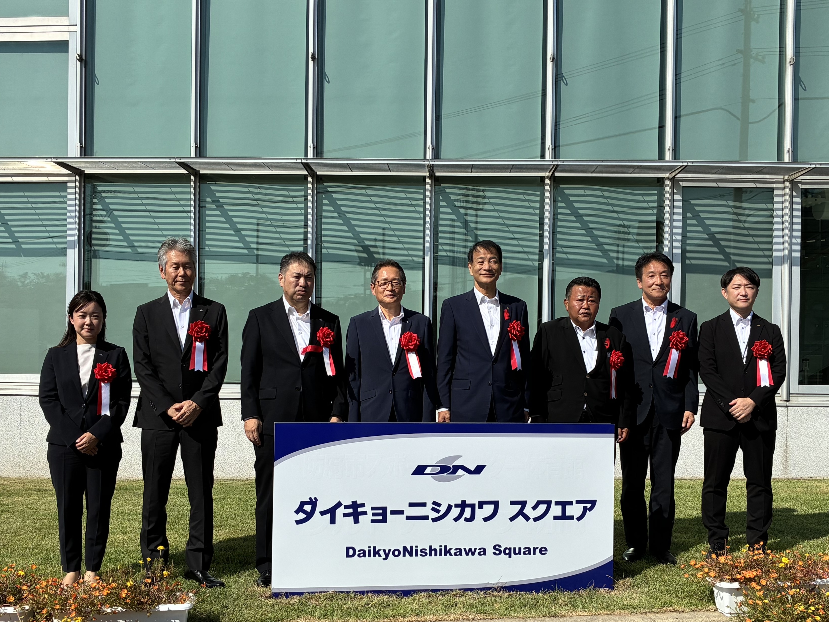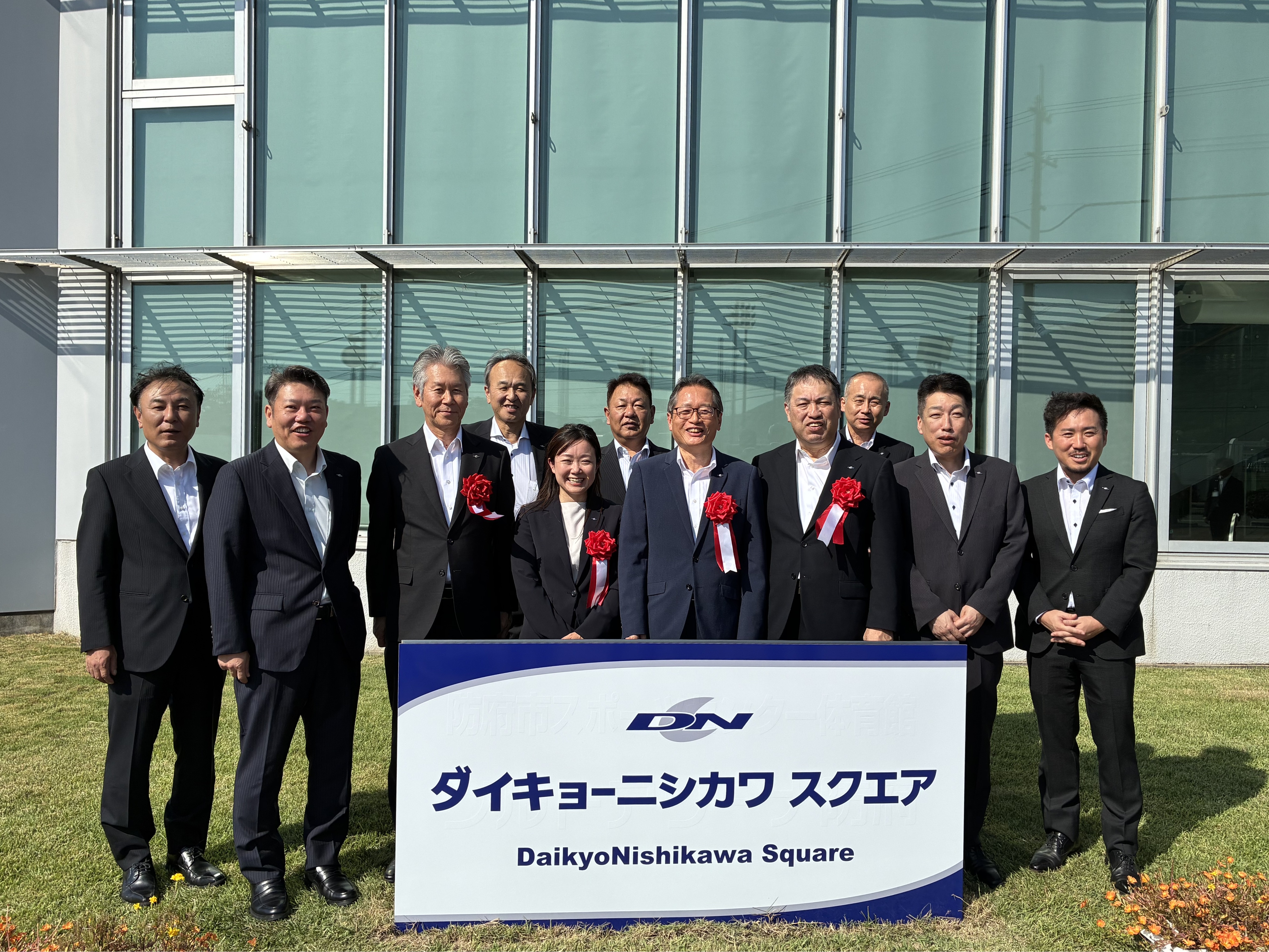 10月1日、山口県防府市浜方のソルトアリーナ防府にて、防府市スポーツセンターのネーミングライツ取得に伴う看板除幕式(主催:防府市)が執り行われました。当日は防府市長の池田豊様をはじめご来賓の皆様のご臨席の下、新愛称「ダイキョーニシカワ スクエア」の看板がお披露目されました。